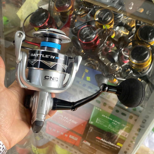 Battle IV 5000DX .Máy đứng ,Bạc đạn 6+ 1,Màu bạc ,Gear 5.3:1 ,Trọng lượng 521 gr ,Drag 11.3kg ,Thu dây 91 cm ,Chứa dây,Mono 0.46mm/125m | Tay quay núm Tròn .GIÁ;2450K